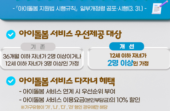 2024년 7월 31일부터 시행된 '아이돌봄 지원법 시행규칙' 개정안은 다자녀 가정의 기준을 기존보다 완화해 더 많은 가정이 아이돌봄 서비스를 우선적으로 받을 수 있도록 했습니다.
