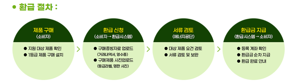 신청 시에는 제품의 에너지효율등급 라벨, 시리얼번호 명판, 거래내역서 및 구매영수증이 필요하며, 환급은 개인당 최대 30만원까지 가능합니다. 만 19세 이상 대한민국 국민이면 누구나 신청할 수 있습니다.