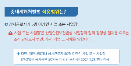 중대재해처벌법은 산업재해와 시민재해를 예방하기 위해 2022년 1월부터 시행된 법입니다. 법의 적용 대상은 상시근로자 50인 이상 사업장과 공중이용시설·이용제품을 운영·제공하는 사업주 및 경영책임자입니다. 또한 2024년 1월부터는 상시근로자 5인 이상 50인 미만 사업장까지 확대 적용되었습니다. 산업 현장에서 인명 피해가 반복되는 현실 속에서, 이 법은 안전관리 의무를 강화해 사고를 줄이기 위한 제도적 장치로 자리 잡고 있습니다.